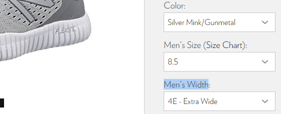 For the screenshot below, this will be: "Color: Silver Mink / Gunmetal; Men's Size: 8.5; Men's Width: 4E".