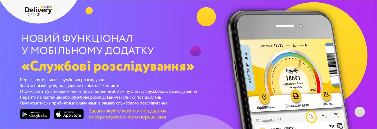 Відтепер, інформація про прибуття вантажу на представництво «Delivery» направляється Отримувачу через пуш-повідомлення мобільного додатку. Для онлайн перегляду інформації завантажте мобільний додаток «Delivery».